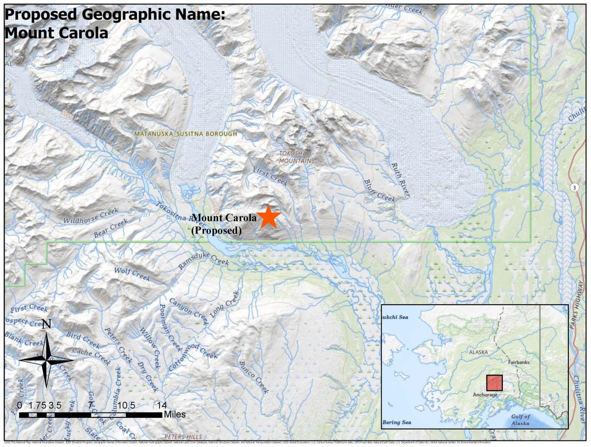 Michele Stevens, daughter of Carola June Young, proposed naming the peak “Mount Carola” to honor her mother, and the proposal had been supported by the Talkeetna Historical Society, the Matanuska-Susitna Borough Planning Commission, the Alaska Miners Association and the Alaska Historical Commission, which voted 6-1 to support the nomination.