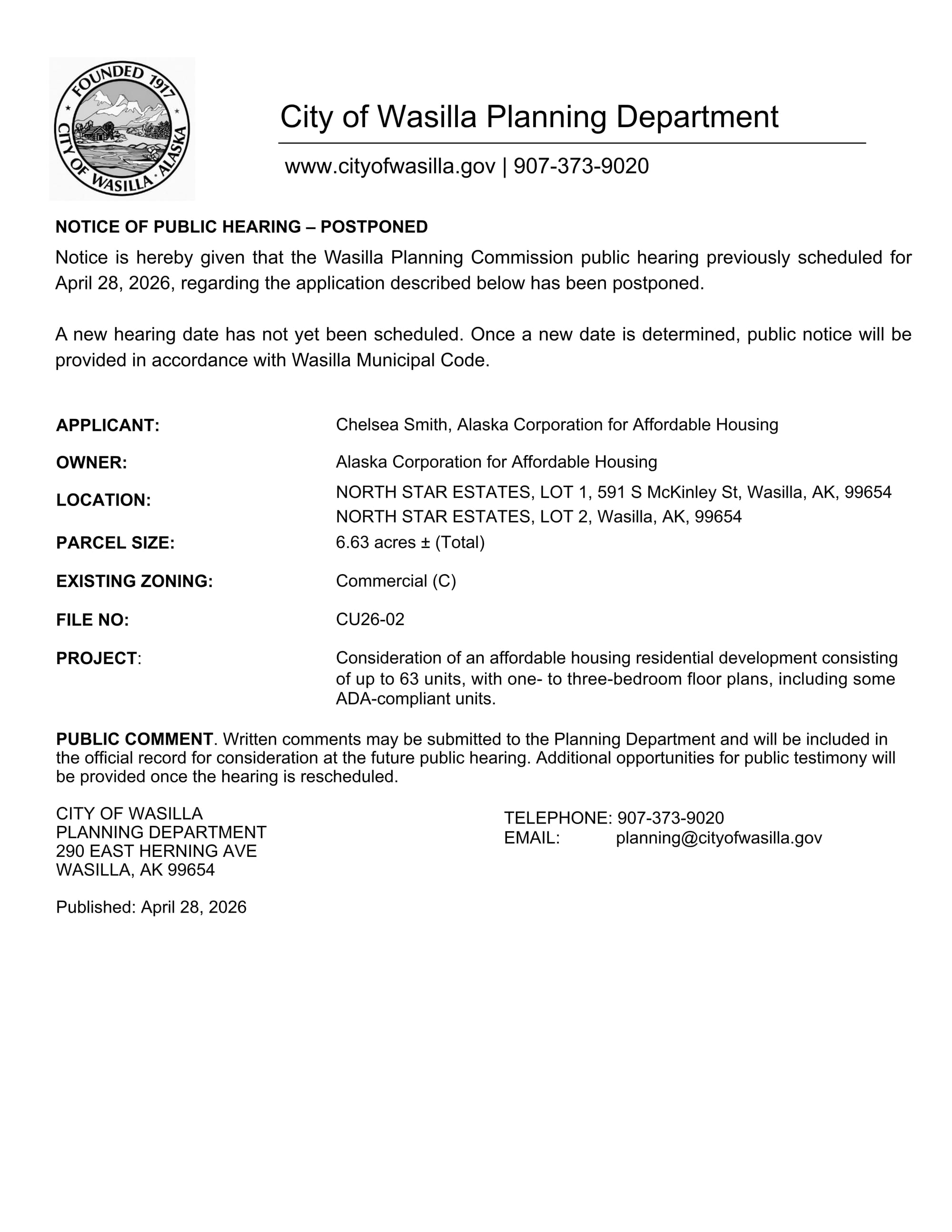 The Wasilla Planning Comisssion public hearing previously scheduled for April 28, 2026 is postponed.