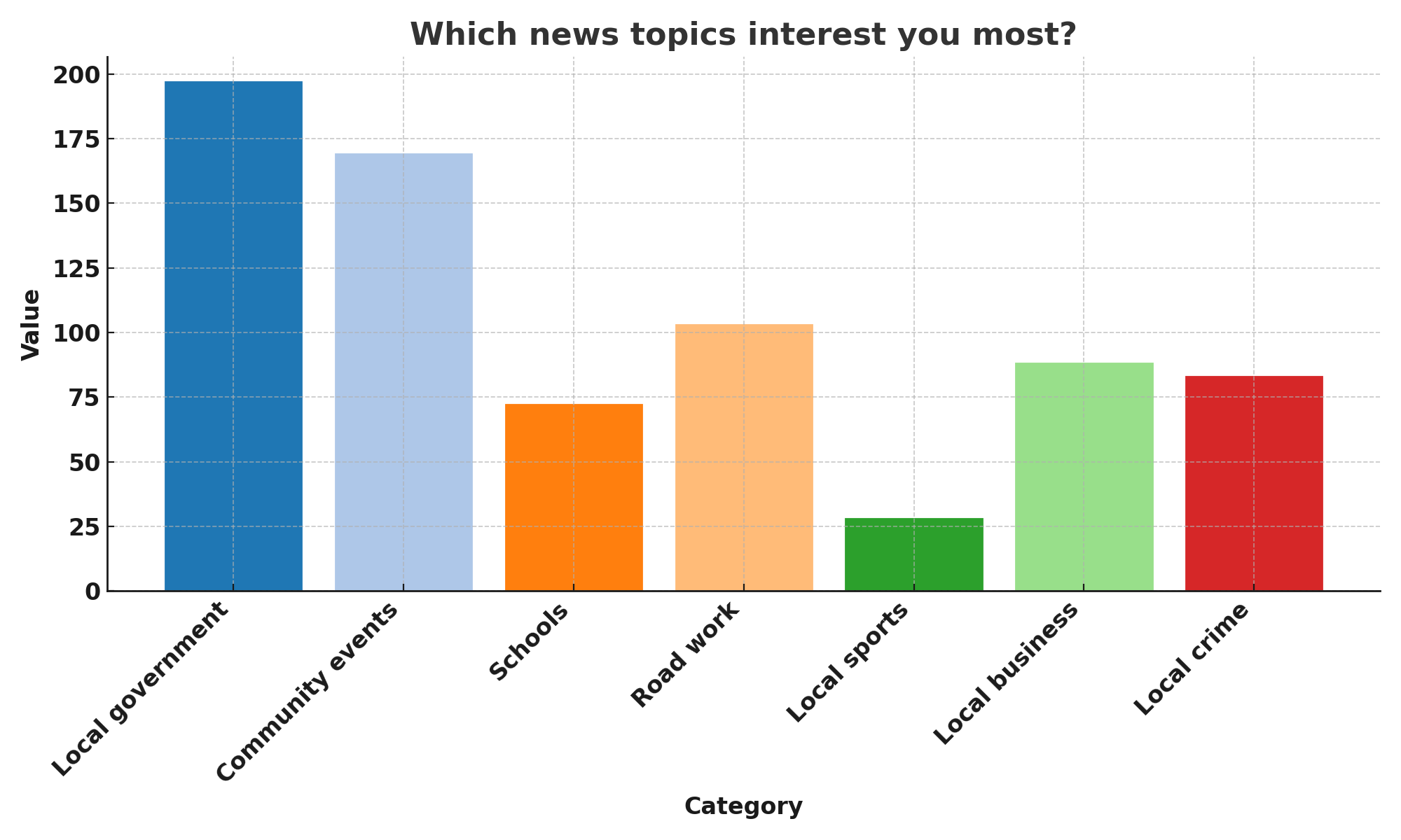 These responses confirmed that the Sentinel is on the right track with its current focus on local government coverage and led us to prioritize community events and road work coverage going forward.