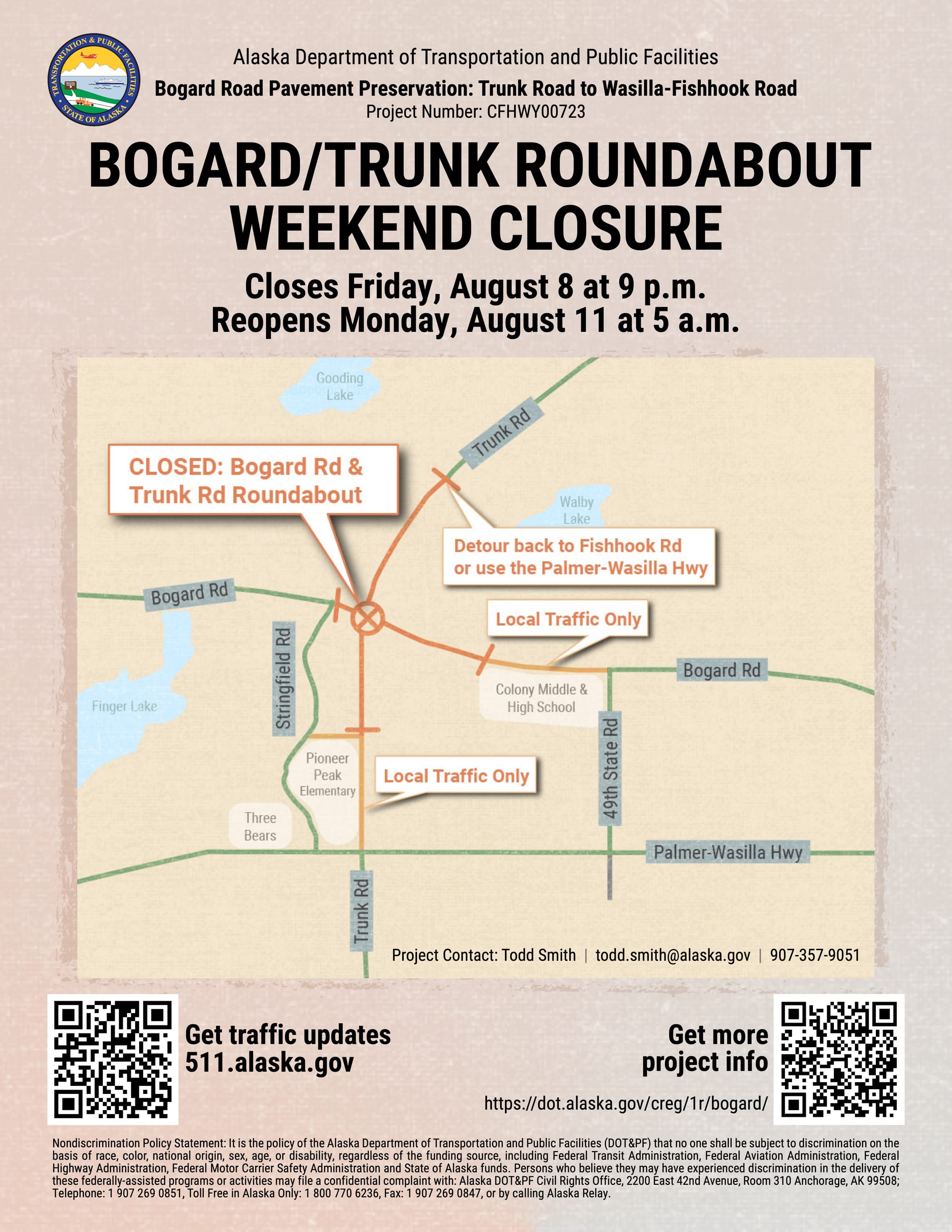 The closure is part of an ongoing $11.5 million Bogard Road paving project stretching from the roundabout to near Wasilla High School. Work started in May and is expected to be complete by Aug. 25, said Todd Smith, a state transportation engineer overseeing the project.